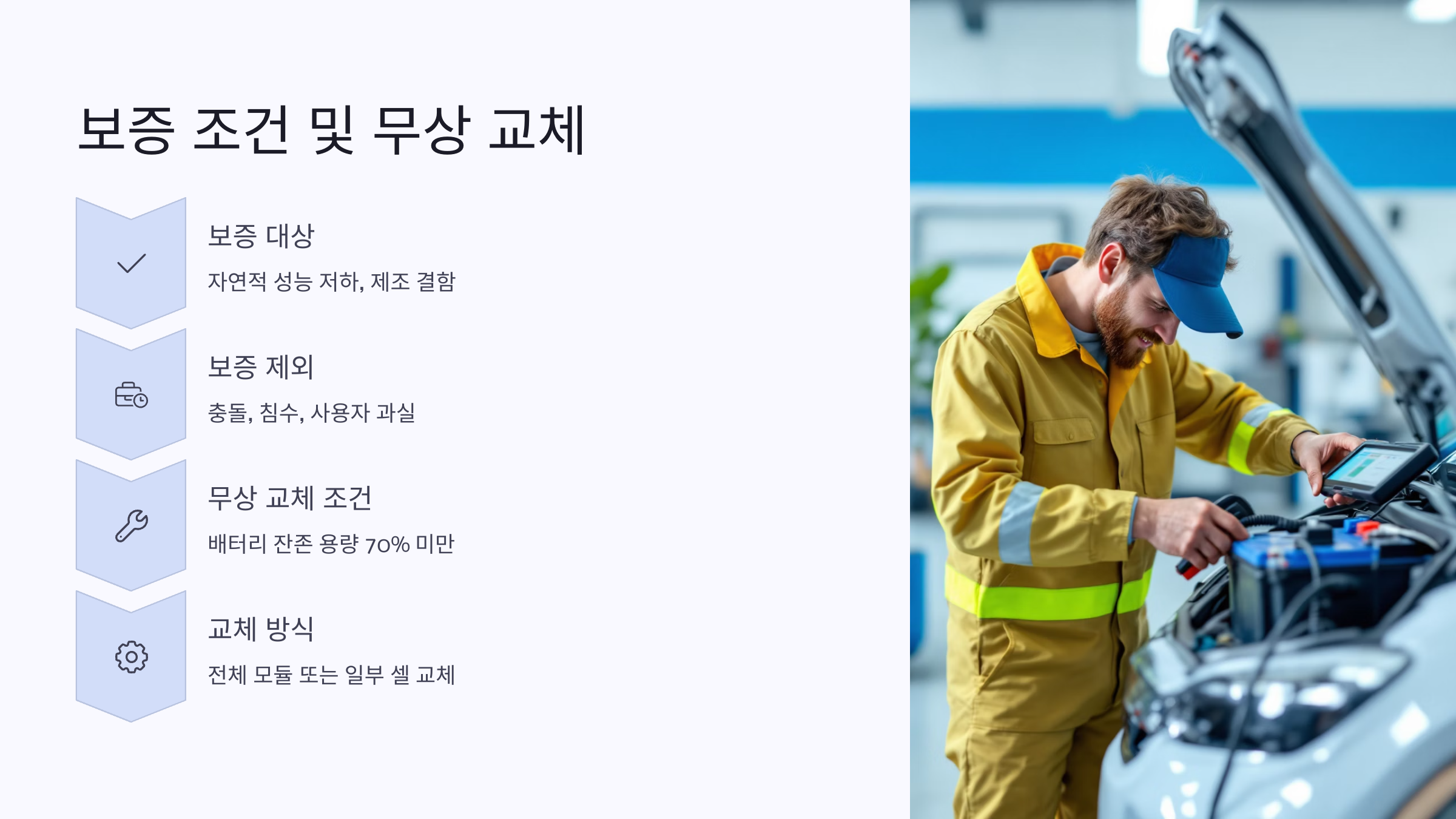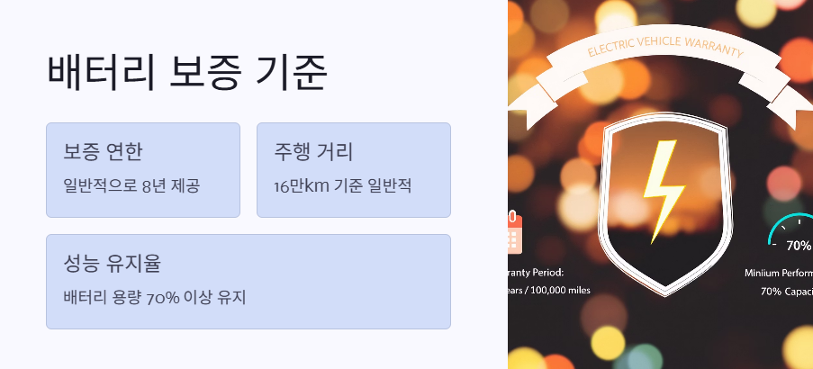 대부분 제조사는 **배터리 잔존 용량이 70% 미만으로 떨어졌을 경우** 무상 교체 또는 수리를 보장해요. 그 기준이 바로 ‘전기차 배터리 보증 기간’에 해당돼요.