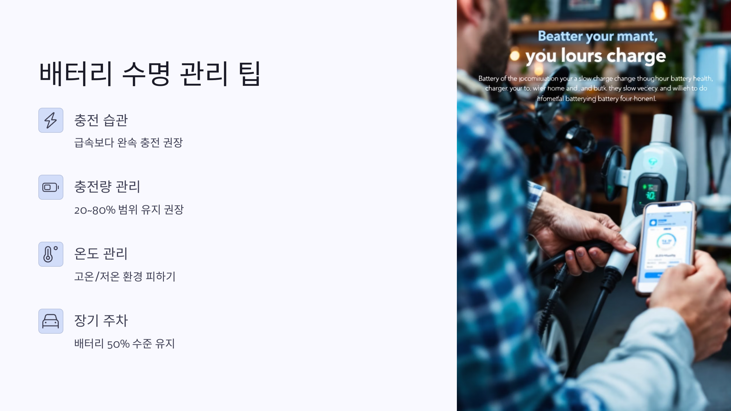 우선 급속 충전보다 완속 충전을 자주 사용하는 것이 배터리 수명에 좋아요. 높은 전압은 셀 노화를 가속시키거든요.