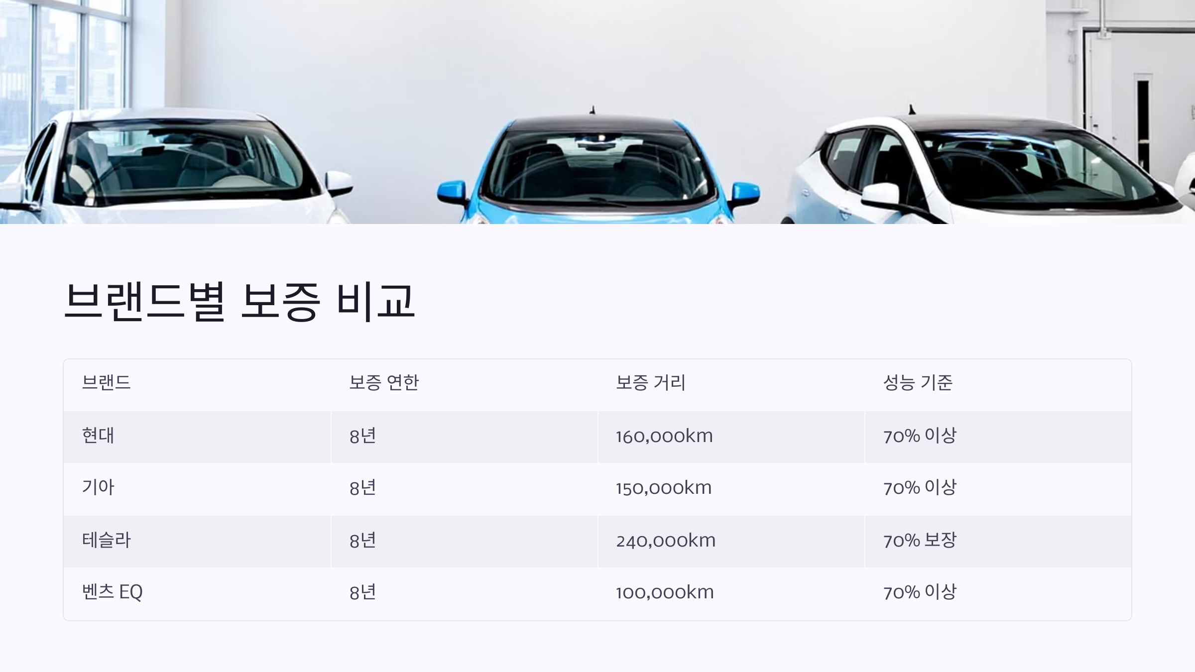 예를 들어 현대차는 8년 또는 16만 km 기준으로 보증하고 있고, 테슬라의 경우 모델별로 상이하지만 최대 8년/24만 km까지 보증돼요.