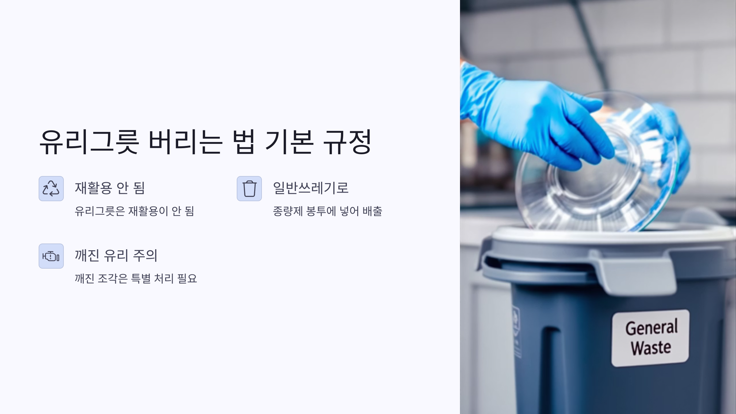 이 때문에 유리그릇은 기본적으로 **일반쓰레기**, 즉 종량제 봉투에 넣어서 배출해야 해요. 단, 깨진 유리일 경우 다르게 처리해야 하니 주의가 필요해요. 깨진 조각은 날카로워서 수거 과정 중 작업자에게 큰 위험이 될 수 있거든요.