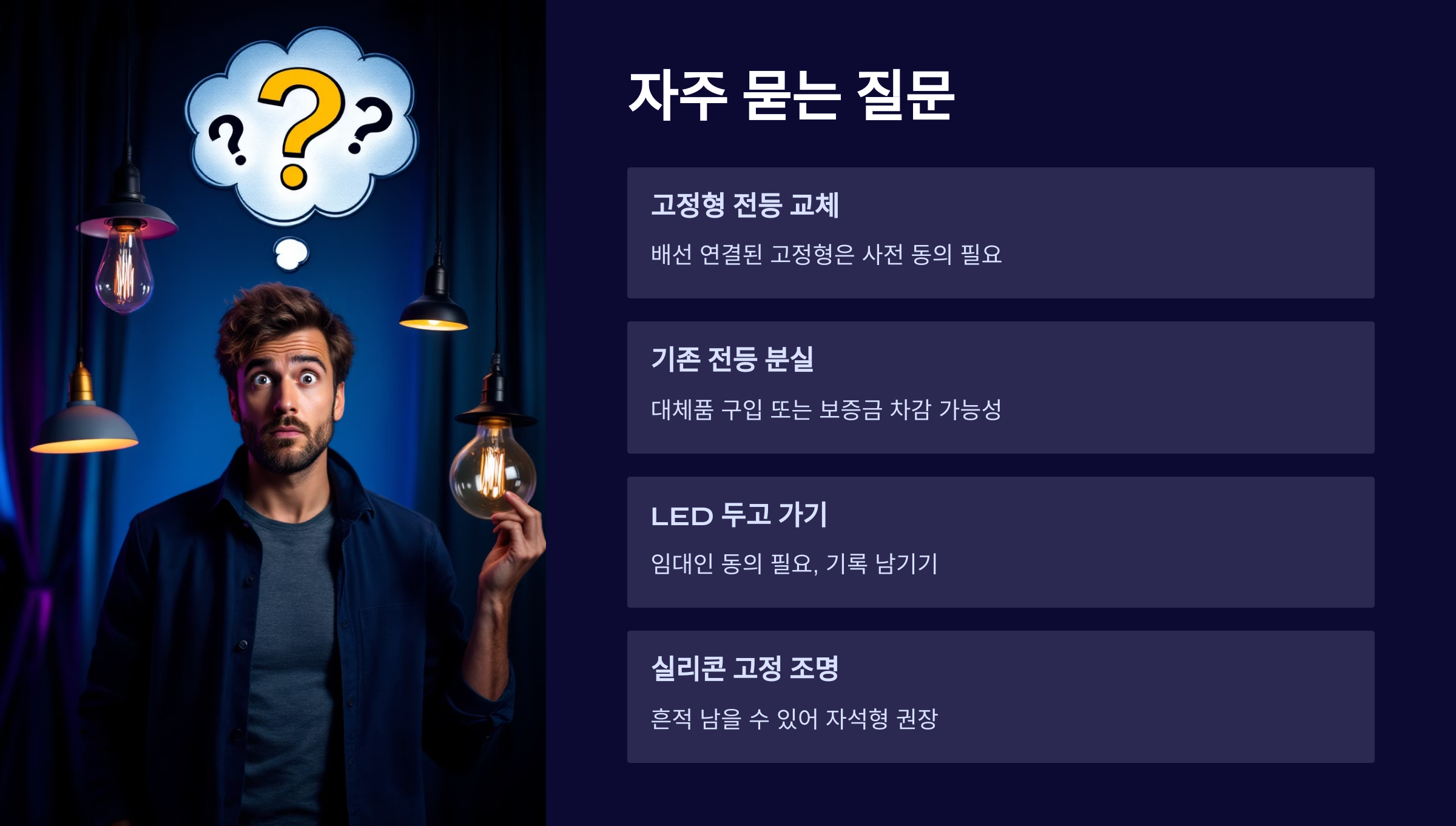 A3. 원상복구가 어려워지므로, 대체 제품을 구입하거나 보증금에서 비용이 차감될 수 있어요. 교체 후엔 꼭 기존 전등을 보관하세요.