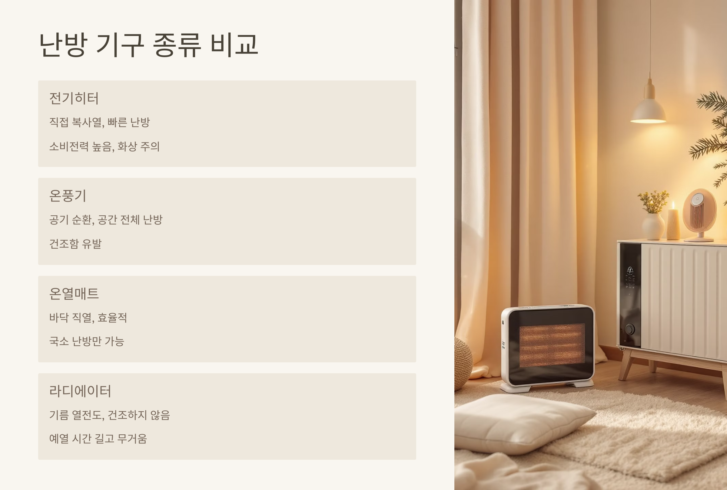 | 온풍기 | 공기 순환 | 공간 전체 따뜻하게 | 건조함 유발 |