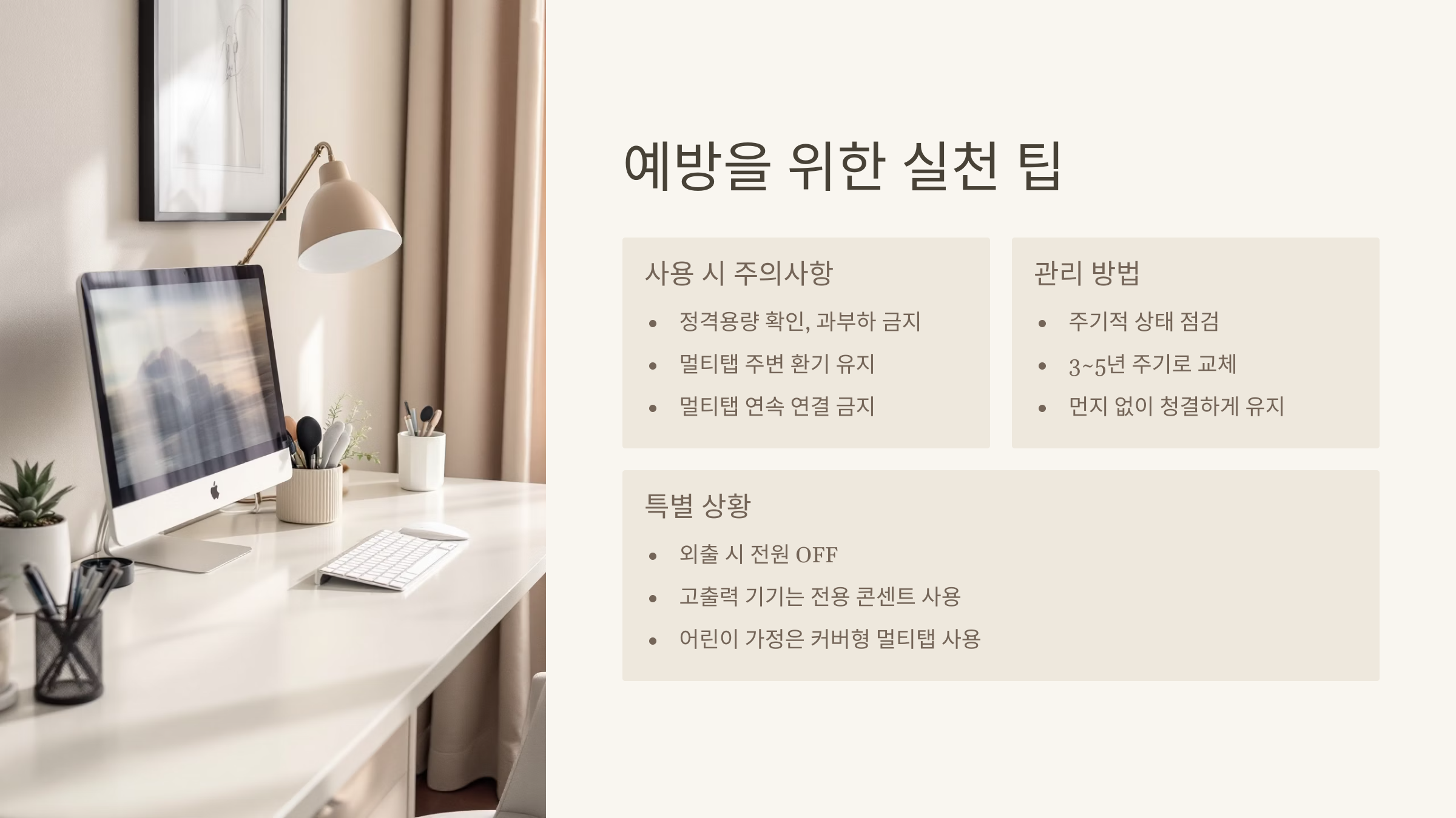 ✔ 주기적으로 멀티탭 상태 점검 및 3~5년 주기로 교체