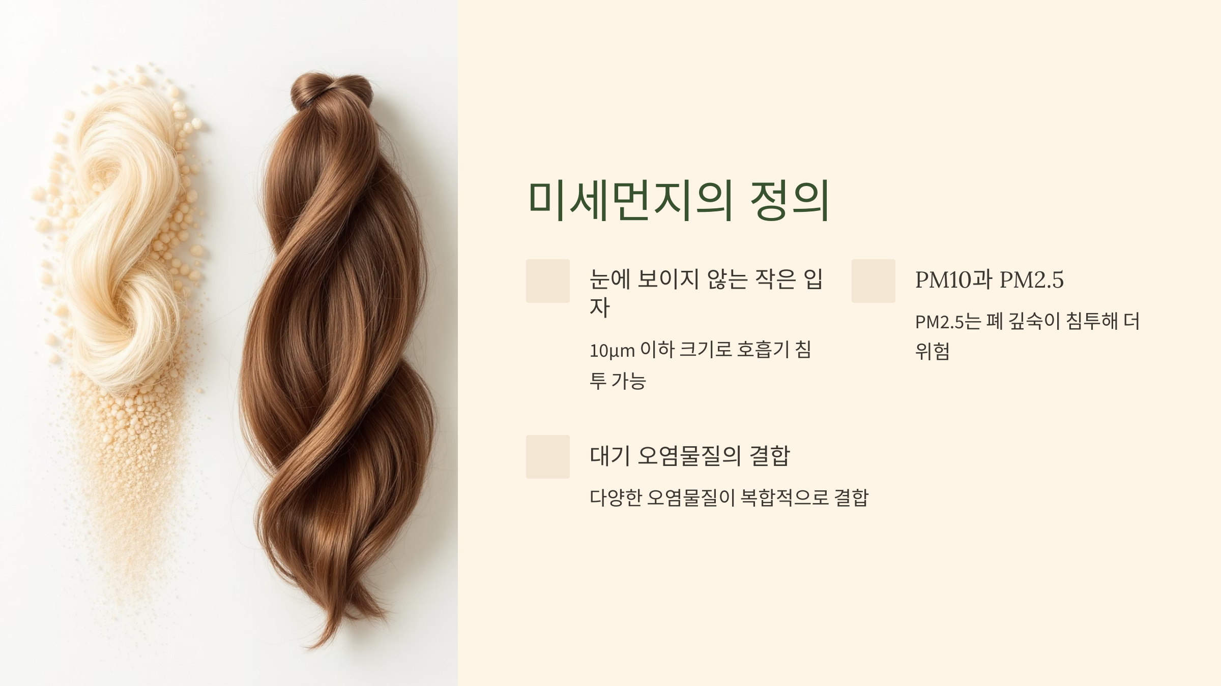 미세먼지는 크게 두 가지로 나눠져요. 하나는 ‘PM10’이라고 불리는 10μm 이하의 입자들이고, 다른 하나는 ‘PM2.5’라고 불리는 2.5μm 이하의 더 작은 입자들이에요. PM2.5는 더 작아서 폐 깊숙이까지 침투할 수 있어 건강에 훨씬 더 해롭답니다.