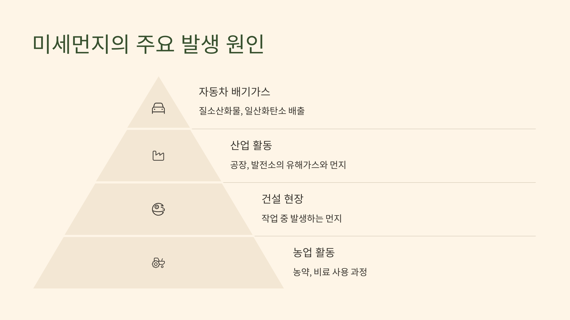 마지막으로 ‘농업 활동’도 미세먼지 발생 원인 중 하나에요. 농업에서 발생하는 농약이나 비료의 사용, 농작물의 재배 및 수확 과정에서도 미세먼지가 발생할 수 있어요.