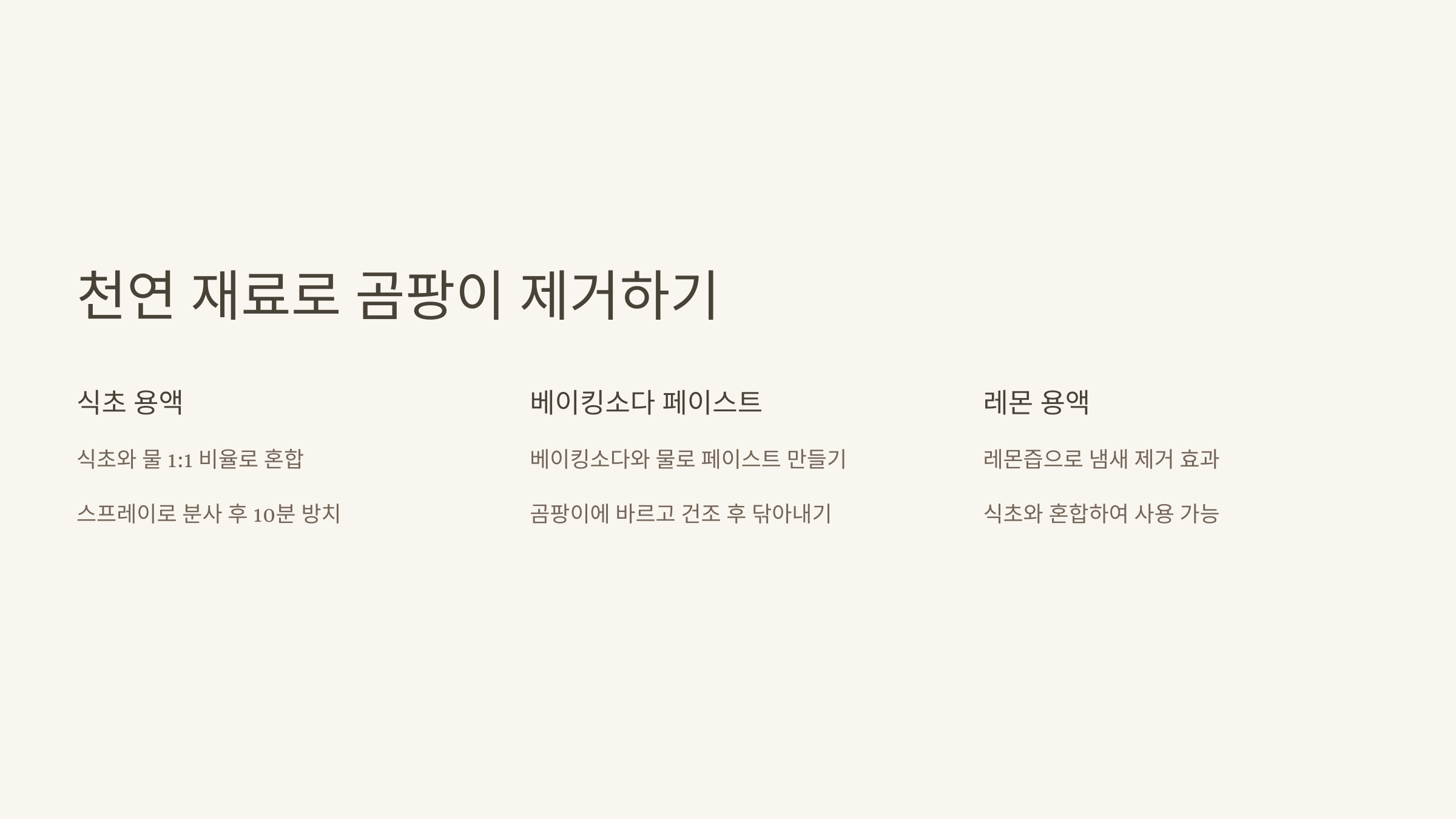 | 환기 자주 하기 | 습기 제거, 공기 순환 | 특히 장마철에 중요 |