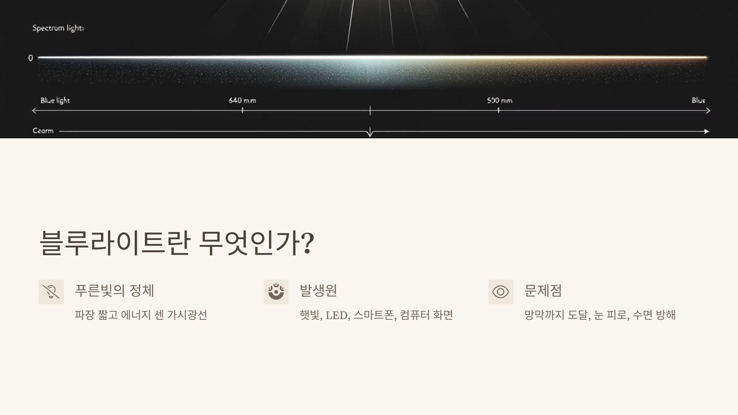 블루라이트, 쉽게 말해 ‘푸른빛’이에요. 우리가 눈으로 볼 수 있는 가시광선 중에서도 파장이 짧고 에너지가 센 빛이에요. 햇빛에도 있고, LED 조명이나 스마트폰, 컴퓨터 화면, 심지어 TV에서도 나오죠.