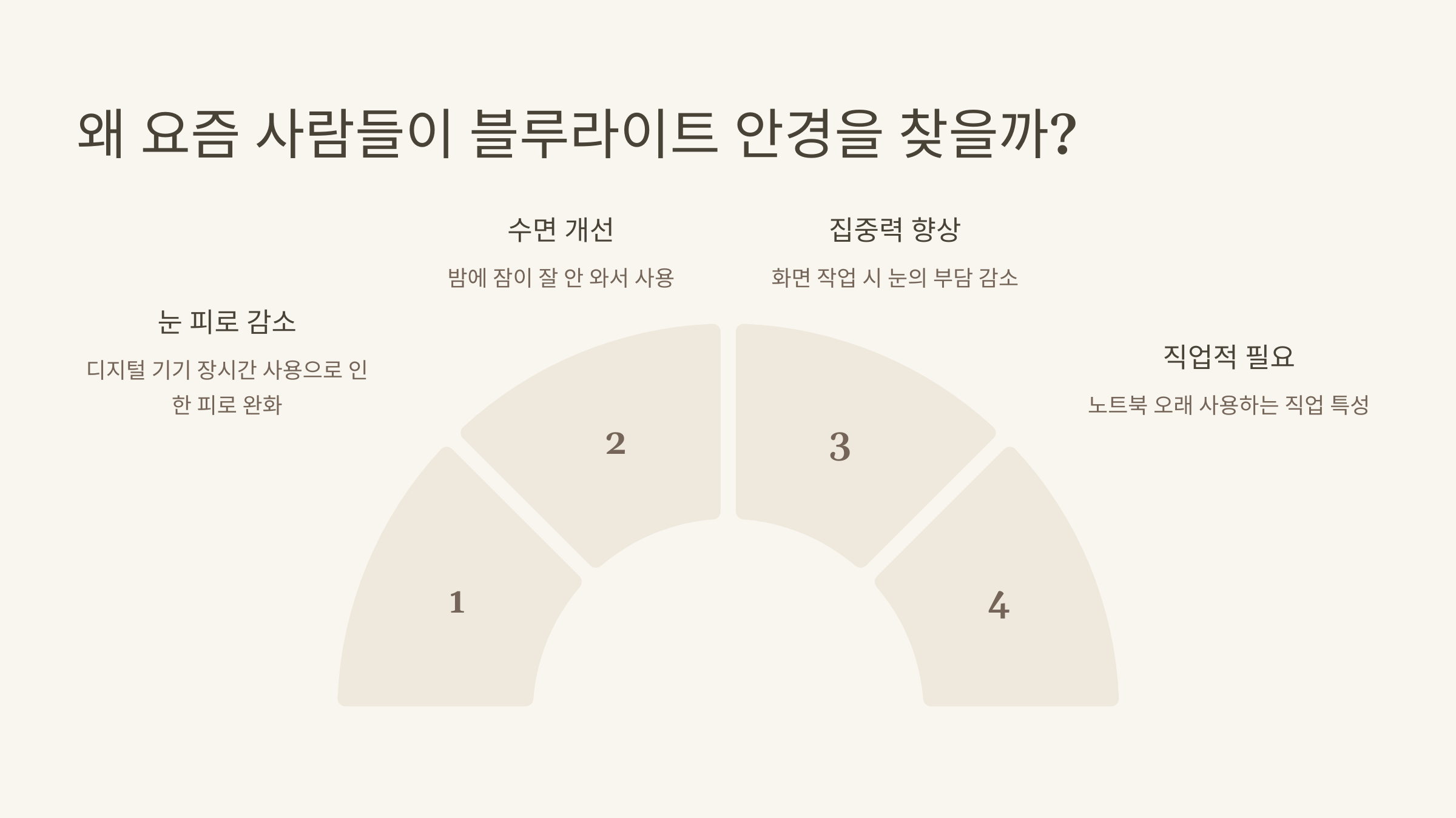 실제로 한 조사에 따르면, ‘블루라이트 안경을 구매한 이유’로 가장 많이 꼽힌 건 “눈의 피로 감소”였고, 두 번째는 “밤에 잠이 잘 안 와서”였어요. 현대인의 눈은 휴식이 아니라 방어를 필요로 하고 있는지도 몰라요.