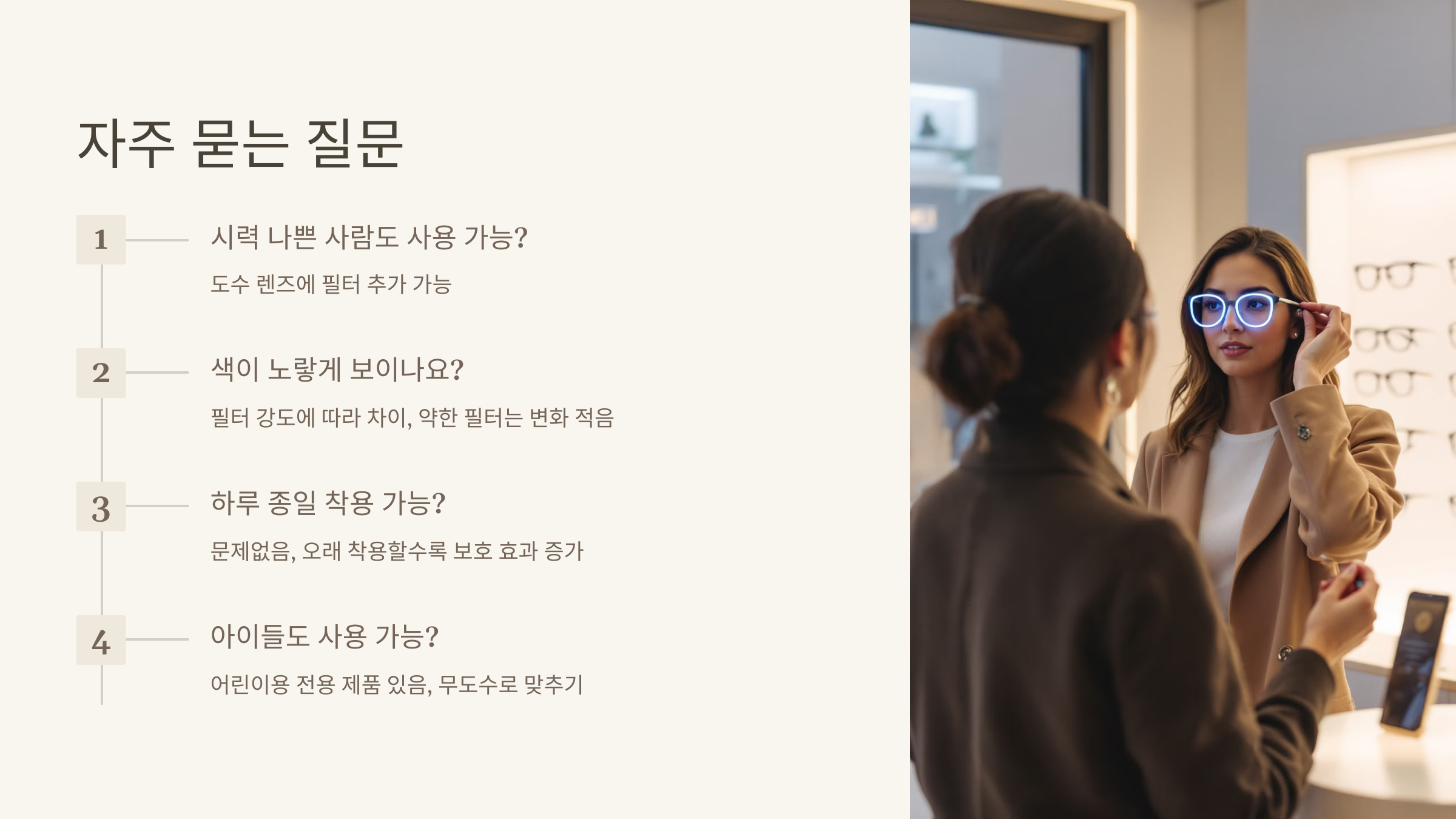 A1. 당연히 가능해요! 도수 렌즈에 블루라이트 필터를 추가해 제작할 수 있어요.