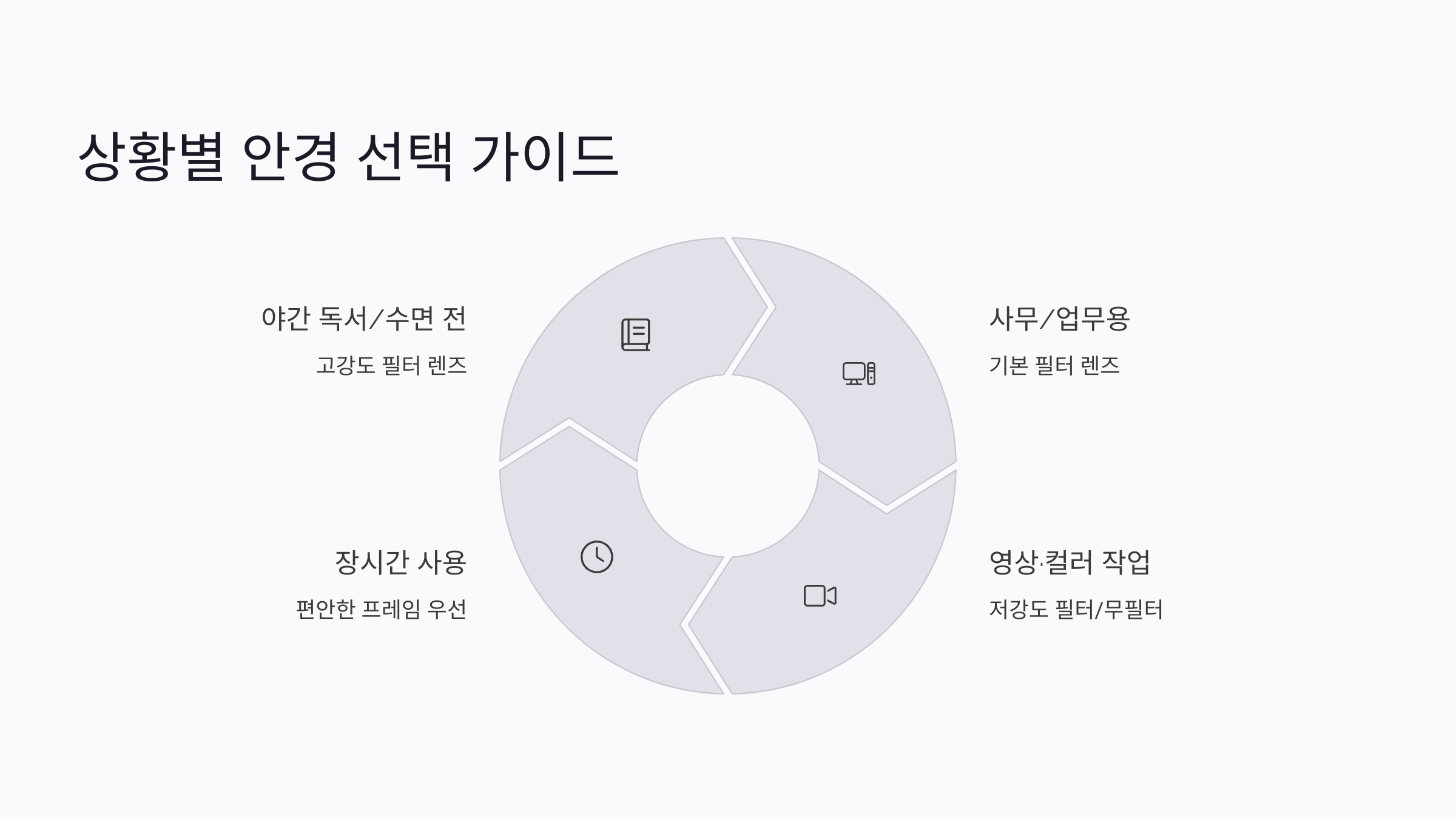 | 사무/업무용 | 기본 필터 렌즈 | 차단율 부족 시 효과 미약 |