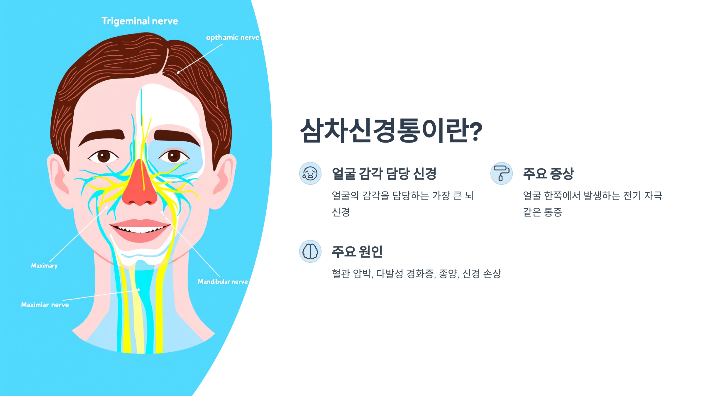삼차신경은 얼굴의 감각을 담당하는 가장 큰 뇌신경이에요. 이 신경에 압박, 염증, 또는 혈관 접촉 등으로 손상이 생기면 극심한 통증이 발생하는데, 이것이 바로 삼차신경통이에요.