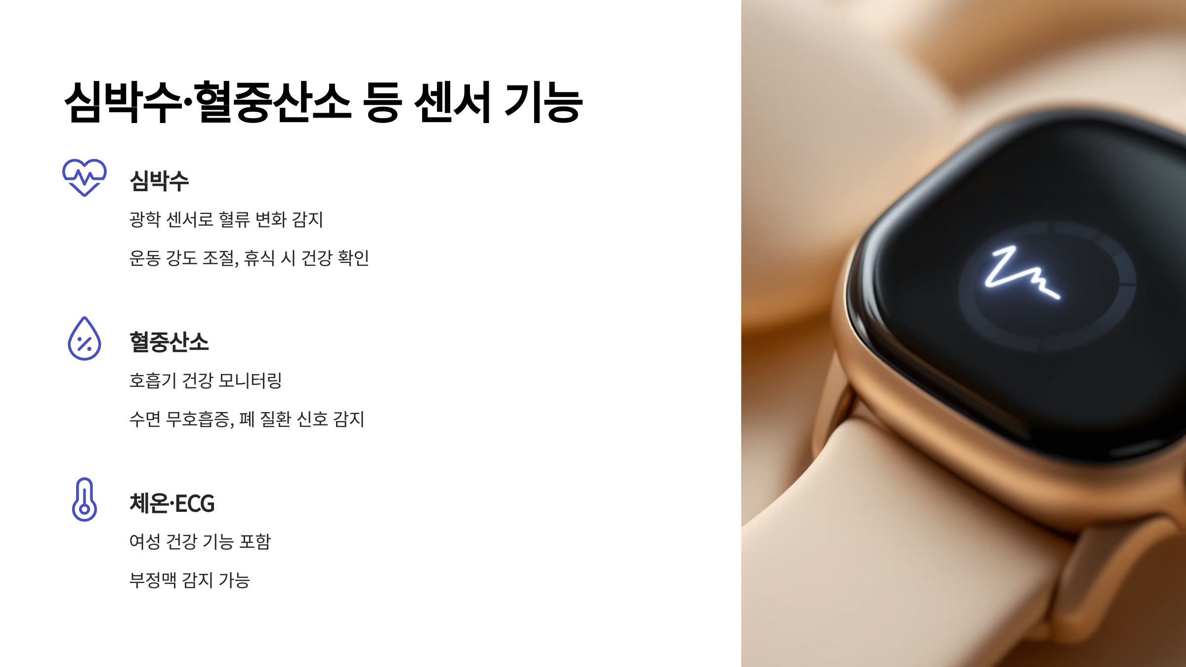 | 심박수 | 광학센서 | 운동, 안정 시 상태 모니터링 | 기기 밀착 상태 중요 |