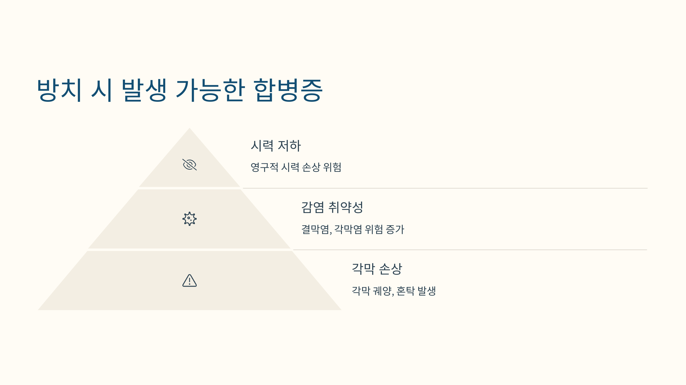 각막 손상 및 궤양: 눈물층이 제 기능을 하지 못하면 각막 표면이 손상되어 염증이 생기기 쉽고, 심할 경우 각막 궤양이나 혼탁으로 발전하여 영구적인 시력 저하를 초래할 수 있습니다.