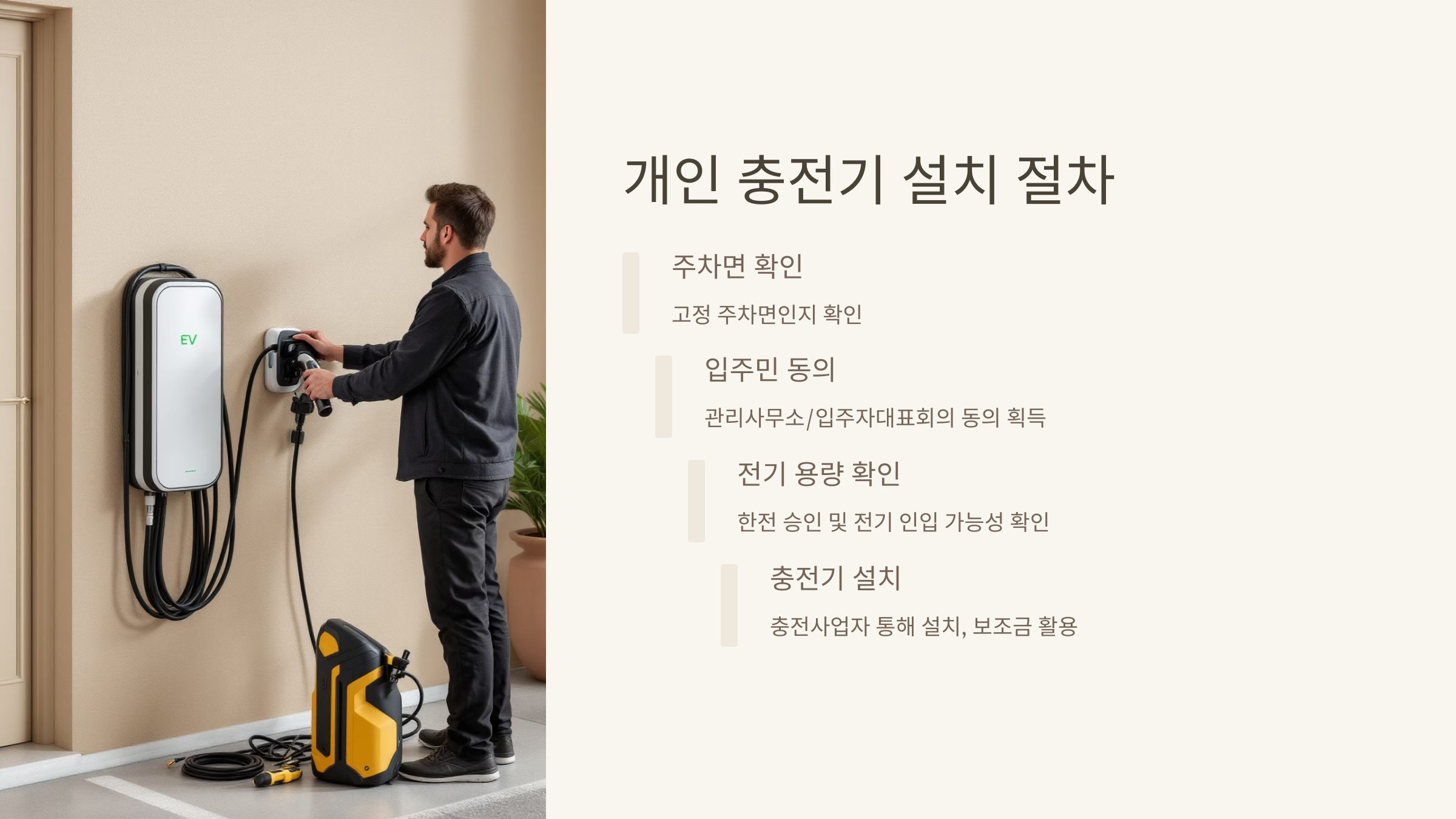 개인 충전기는 자신이 사용하는 주차면에 설치하는 방식으로, 사용 편의성은 뛰어나지만 설치까지 다소 절차가 복잡합니다. 설치를 위해서는 입주자대표회의나 관리사무소의 동의, 전력 공급 확인, 한국전력이나 충전사업자와의 협의가 필요합니다.