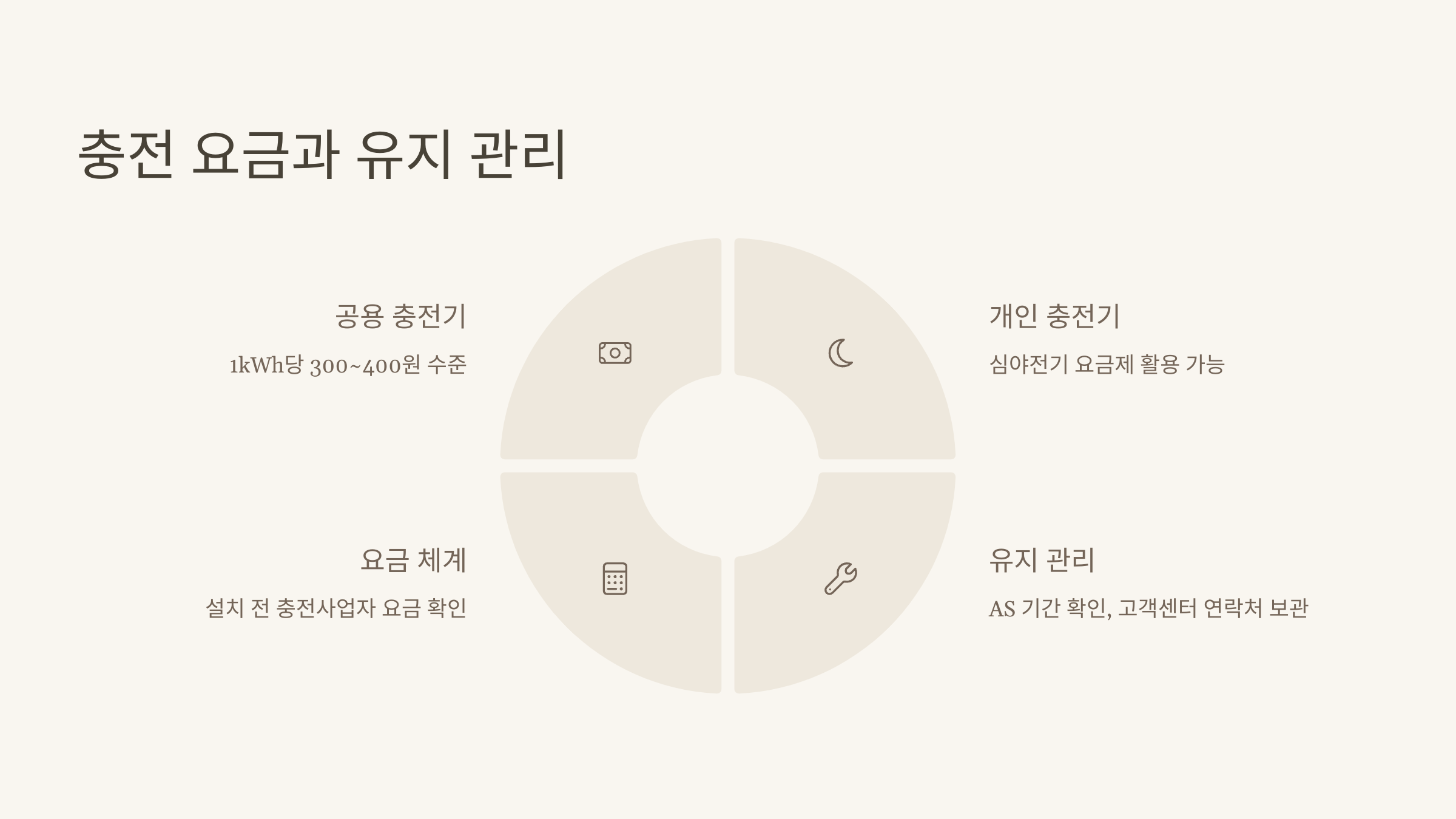충전사업자와 계약 형태에 따라 요금이 달라질 수 있으니 설치 전 요금 체계를 확인하는 것이 중요합니다.