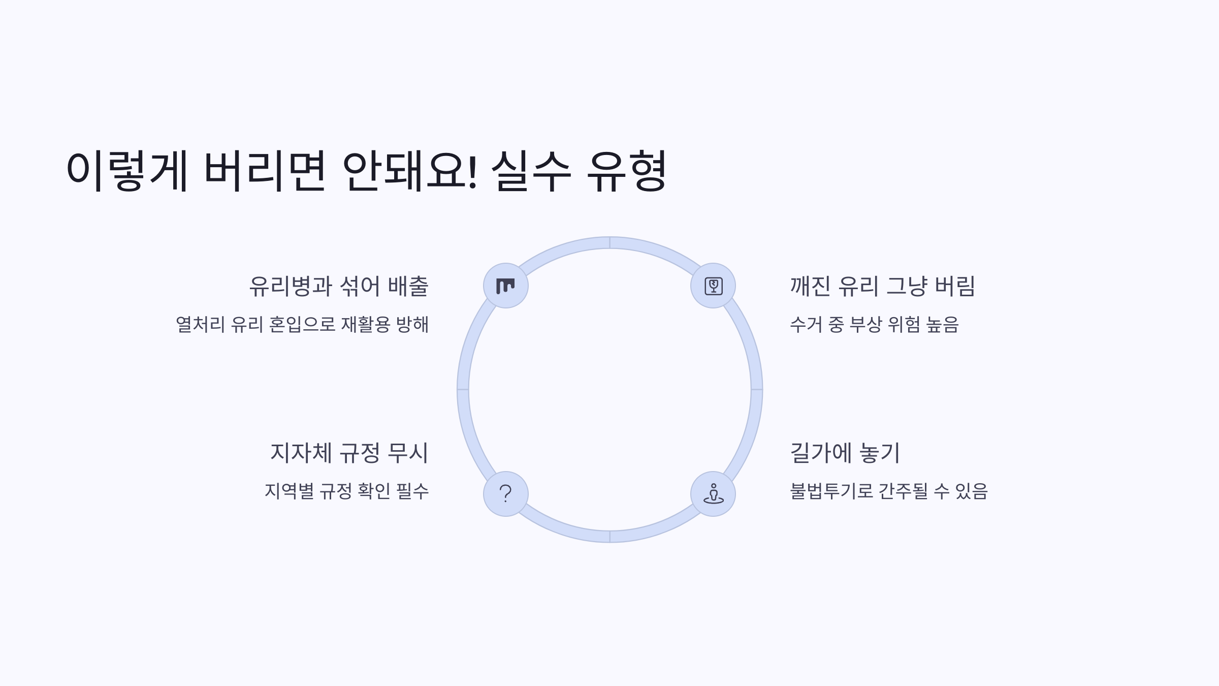 | 깨진 유리 그냥 버림 | 수거 중 부상 위험 | 신문지로 포장 후 표시 |