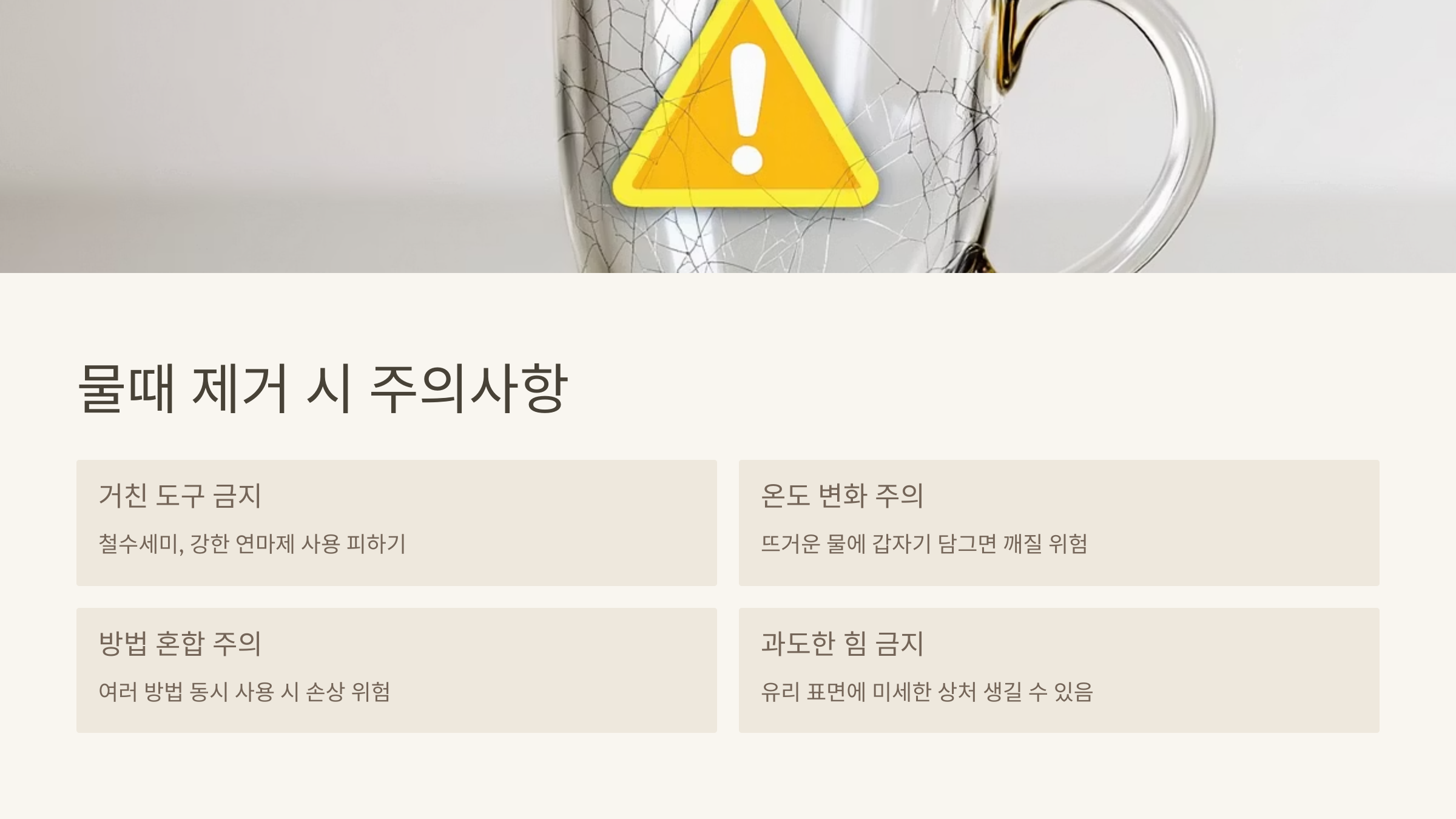 특히 철수세미, 연마제 성분이 강한 클렌저, 과도한 힘을 가한 문질러 닦기는 유리 표면에 미세한 상처를 내서 오히려 물때가 더 잘 생기게 만들어요.