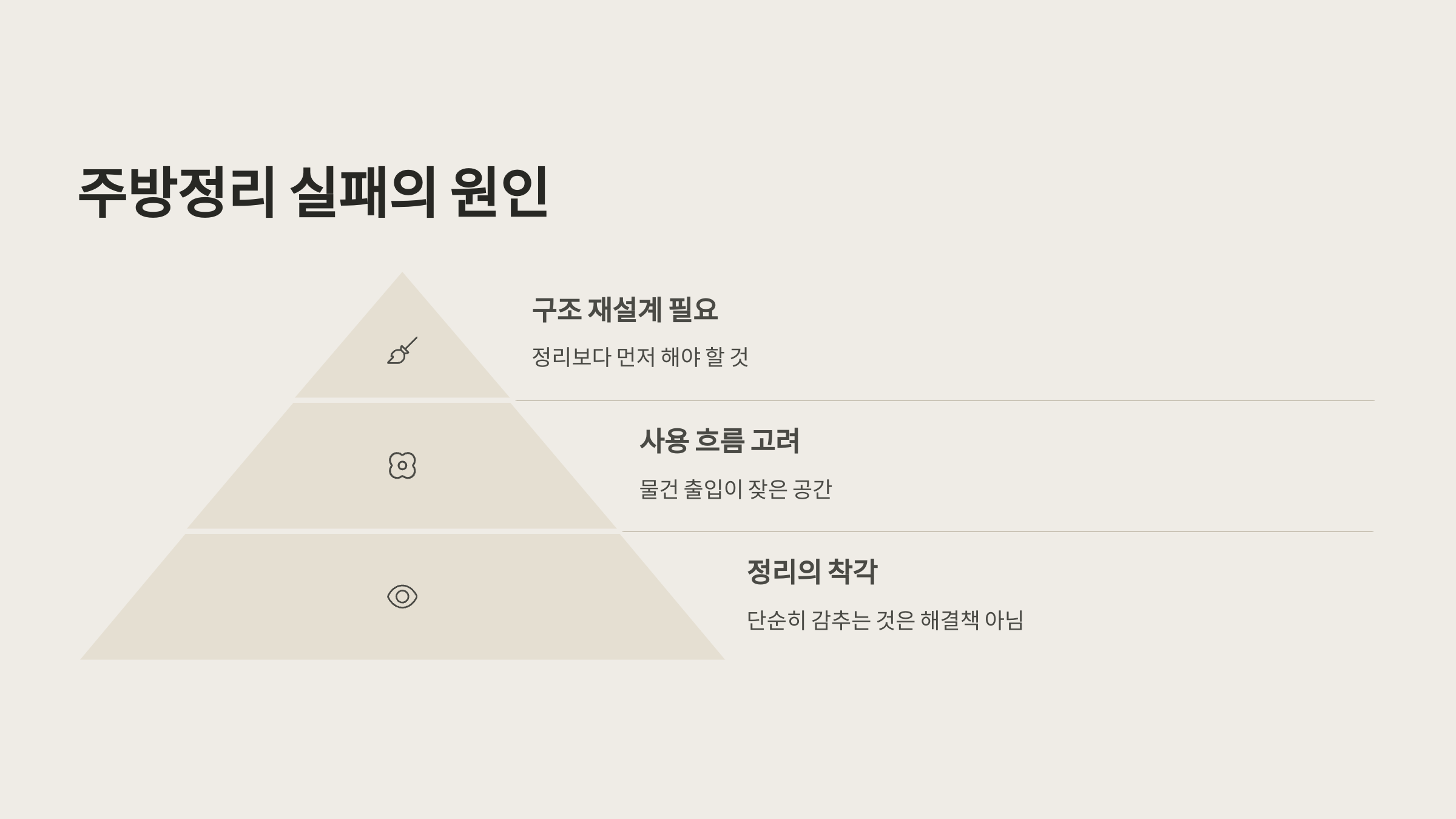 매일 정리하는데도 금세 어지러워지는 주방, 왜 그럴까요? 문제는 정리의 방법이 아니라 ‘정리에 대한 오해’에서 시작돼요. 단순히 치우는 것만으로는 공간이 깔끔해지지 않아요.