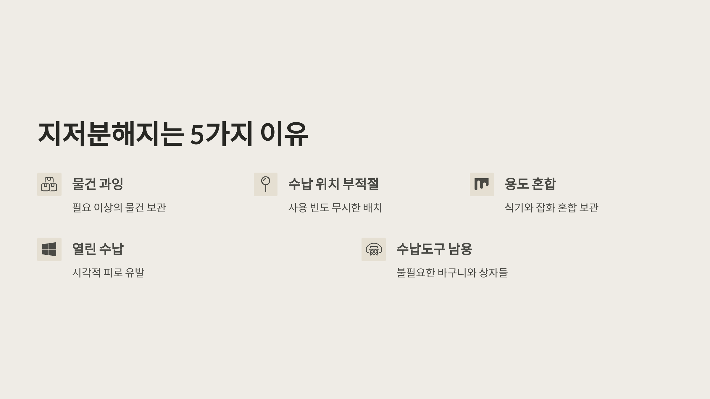 | 수납도구 남용 | 필요 없는 바구니, 상자 | 단순화된 도구 선택 |