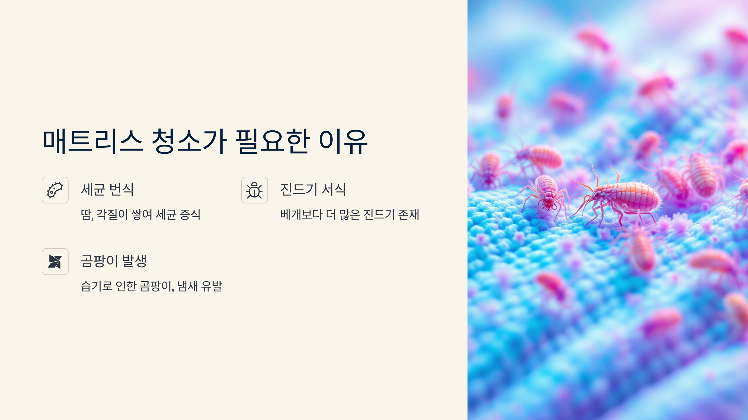 침대는 하루의 피로를 푸는 공간이에요. 그런데 그 침대 매트리스, 마지막으로 청소한 게 언제인가요? 매트리스 속엔 우리 눈에 보이지 않는 먼지, 진드기, 땀 자국이 가득하답니다.