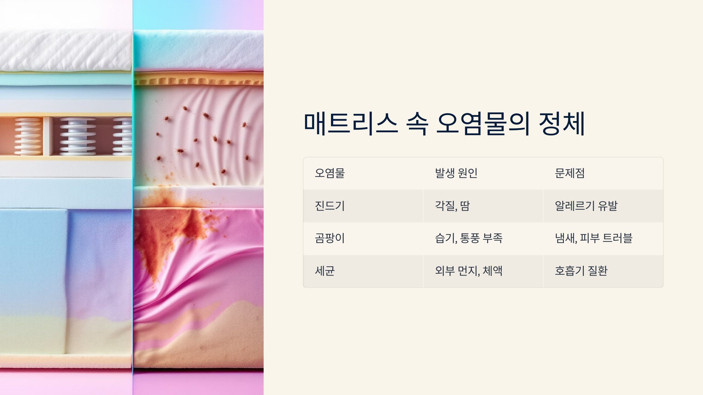 더불어 매트리스는 숨을 쉬지 않기 때문에, 습기가 쌓이면 곰팡이까지 생기기 쉬워요. 여름철엔 냄새로, 겨울엔 호흡기로 문제를 일으킬 수 있어요.