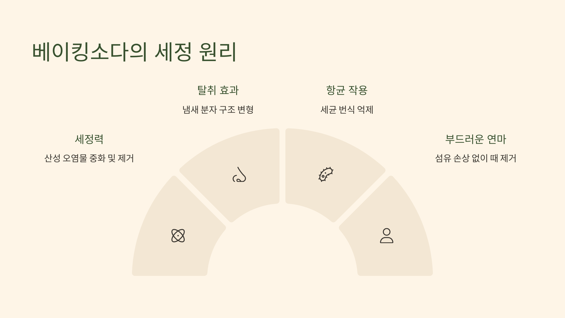 | 베이킹소다 | 세정, 탈취, 연마 | 미지근한 물에 녹여야 효과적 |